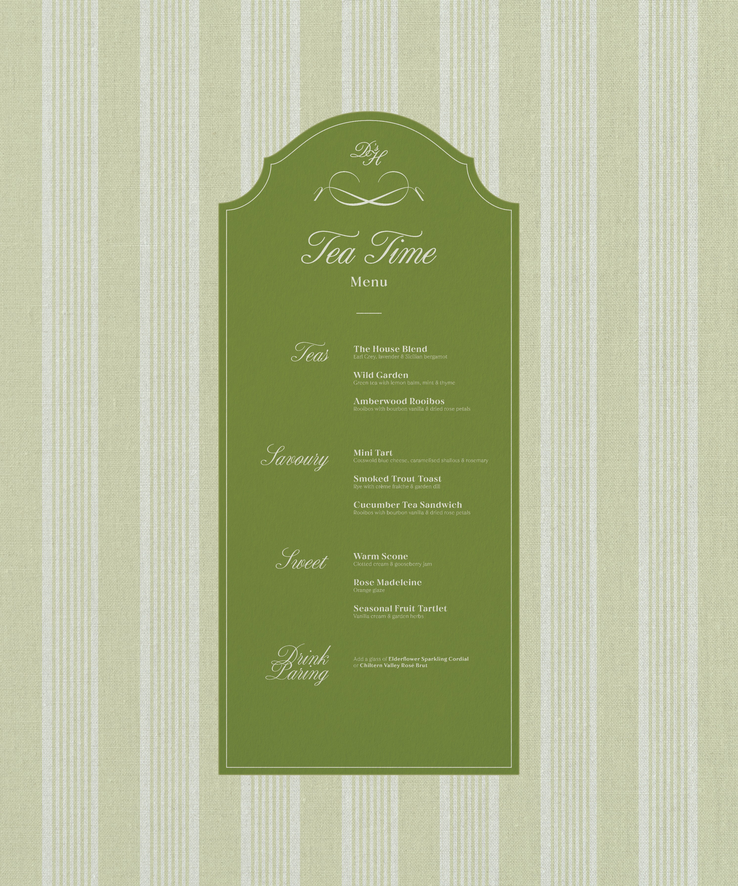 Notre atelier de direction artistique a conçu une identité visuelle sur mesure, mêlant héritage, raffinement et élégance anglaise, avec un logotype singulier, une typographie douce et un territoire visuel inspiré des textures et matières locales.