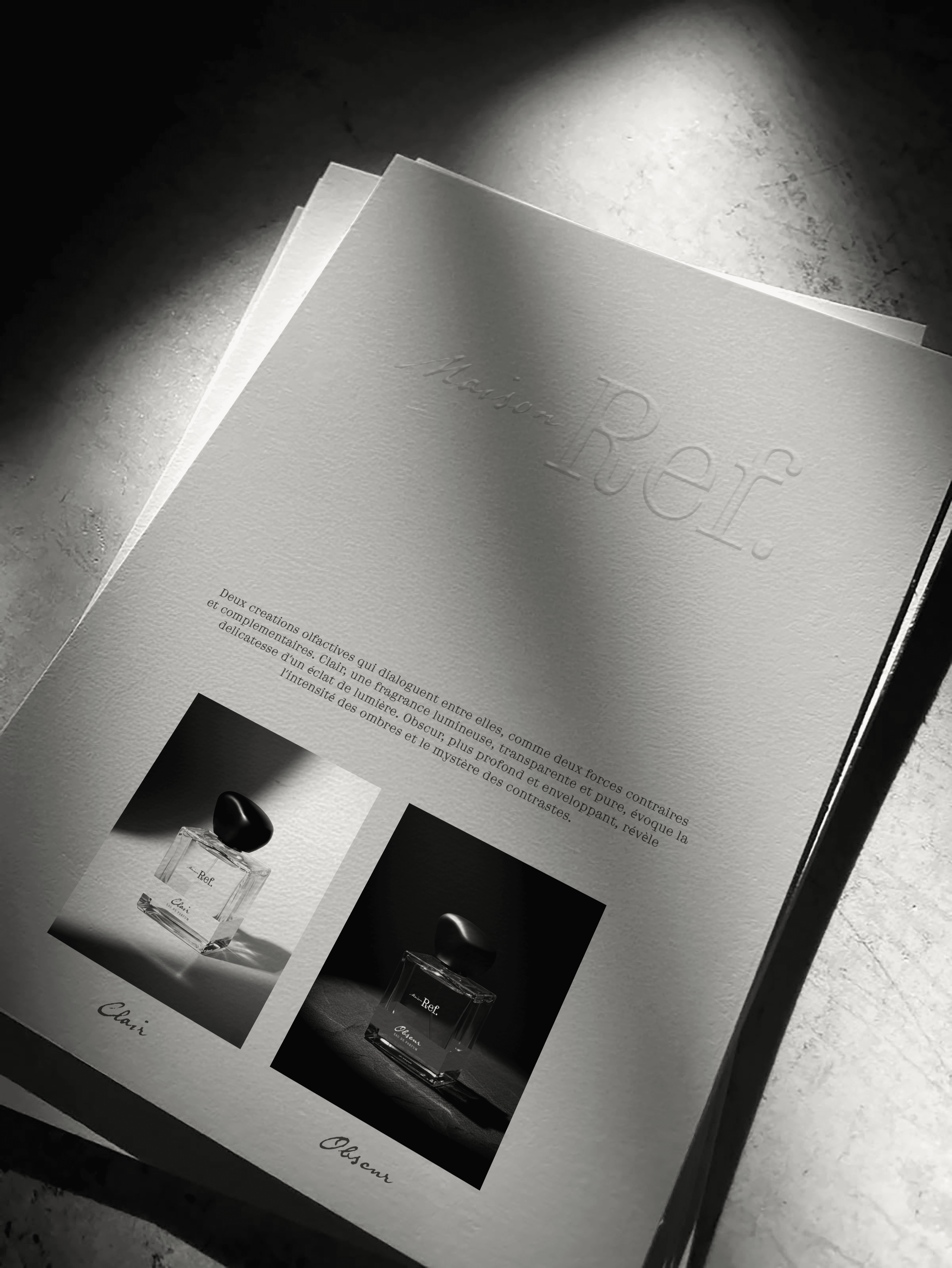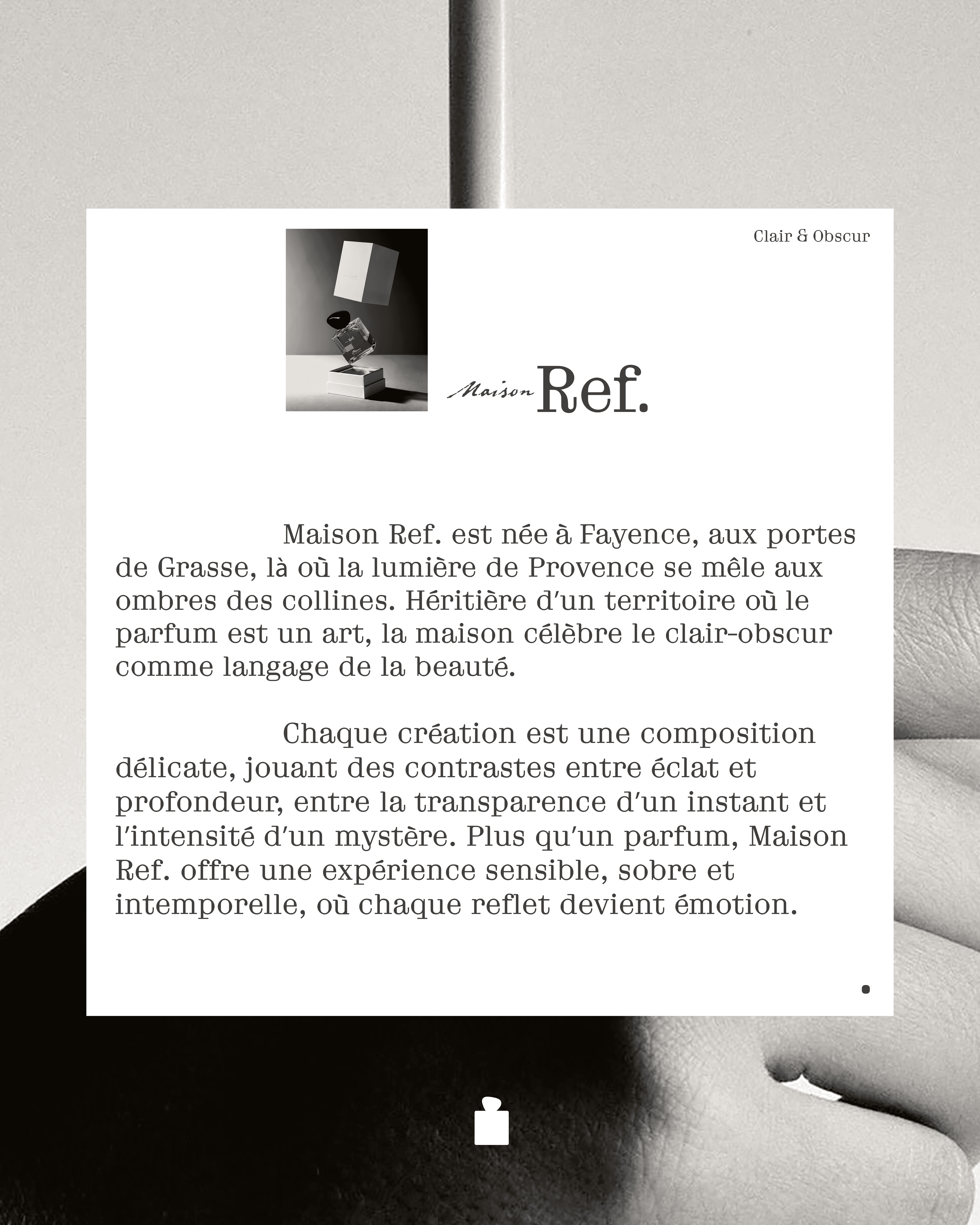 Née à Fayence aux portes de Grasse, la Maison Ref. explore l’art du clair-obscur en célébrant la dualité entre lumière et ombre, pureté et mystère, au cœur d’un univers olfactif sophistiqué.